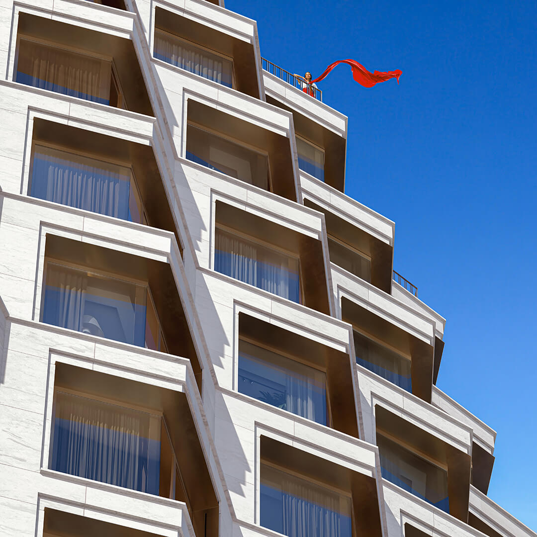 Внешний облик дома словно «огранён» мастером-ювелиром: каждая грань отражает игру света и тени, подчеркивая изысканный ритм фасадов. Использование натурального камня, латуни и металла создаёт ощущение монументальности и лёгкости одновременно. Здесь архитектура становится искусством, а каждая деталь — частью большой философии красоты и смысла.